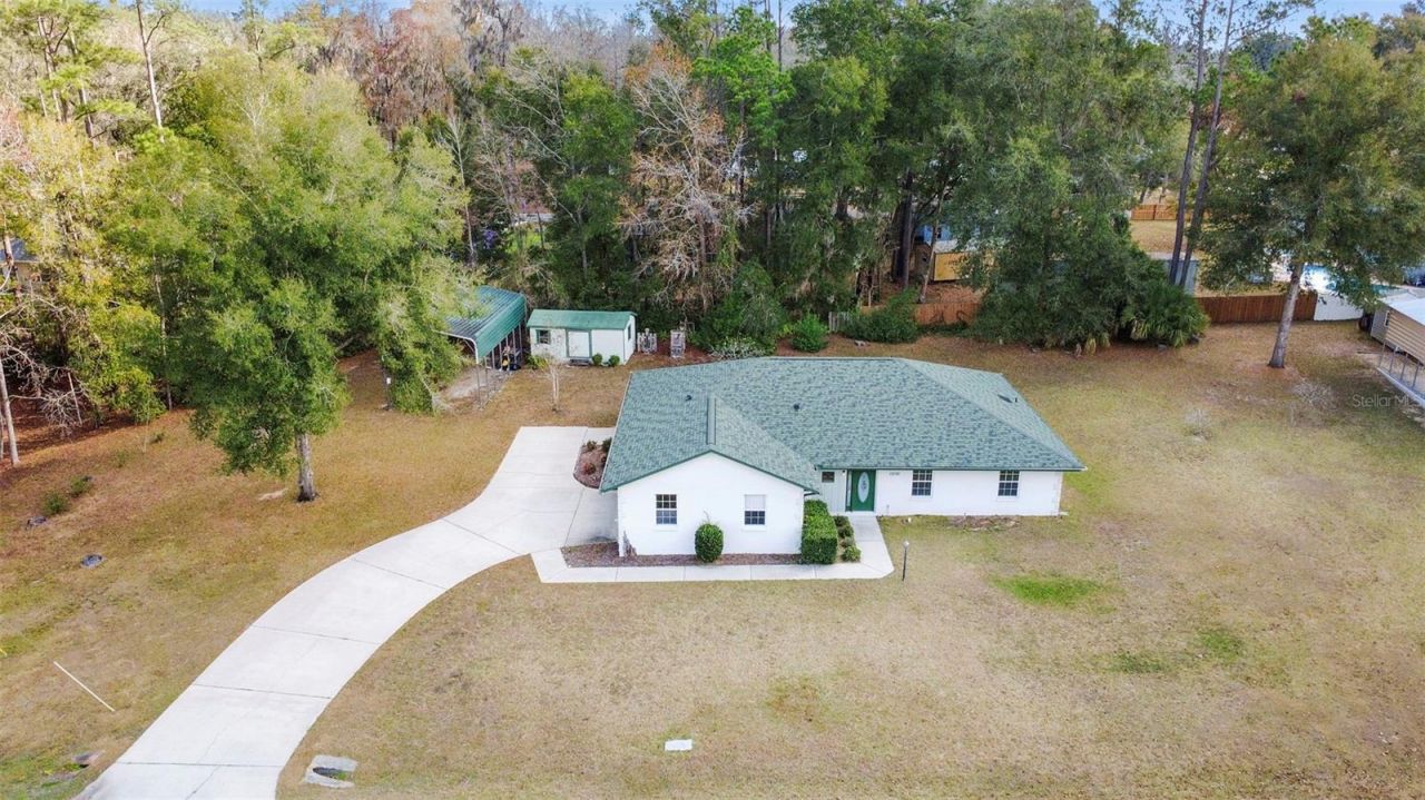 OWNER MOTIVATED! Discover your own private oasis on .62 acres, perfectly positioned close to everything-yet tucked away for peace and privacy. This meticulously maintained, custom built home includes 3-bedroom plus office, 2-bath home sits on a rare double lot with no neighbors on one side and offers lasting privacy and protection from future development. Relax on the charming side porch, or enjoy the light-filled enclosed front porch, thoughtfully transformed into a bright and functional home office. Step inside to find vaulted ceilings, newer flooring throughout the main living areas, and a spacious, well-designed layout ideal for everyday living and entertaining. Feel comfort in this bright, open and statigically flowing floor plan. The primary suite is a true retreat, featuring double vanities and a generously sized walk-in closet. A separate indoor laundry room with utility sink adds convenience to daily life. Major updates provide peace of mind, including a newer A/C and water heater, water softener system, and a roof just one year old.Outside, the possibilities are endless with an attached two-car garage, a detached two-car garage with electric, an additional powered shed, and a cleared backyard with no overhanging trees-perfect for storm-season confidence and future plans. Additional highlights include gutters, sprinkler system, well and septic, and ample space to spread out and enjoy the outdoors.This home seamlessly blends comfort, privacy, and long-term peace of mind-and best of all, NO HOA! Conveniently located just 15 minutes from The Villages and 15 minutes from Ocala, you truly get the best of both worlds.