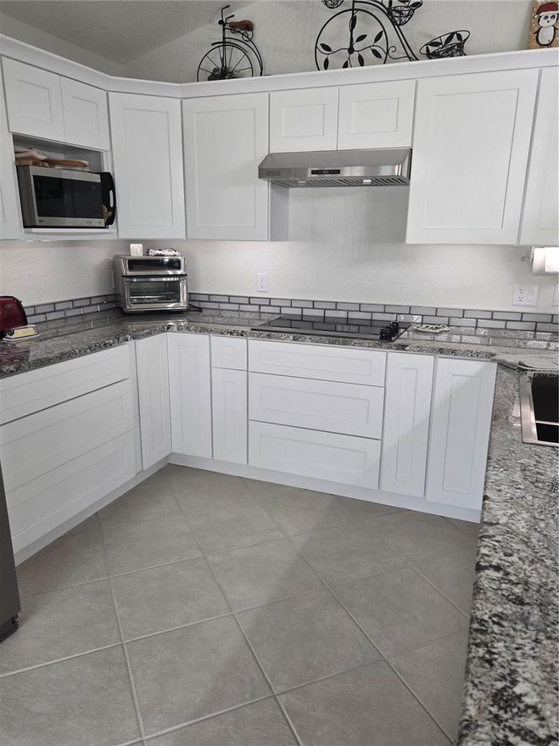 Located in the desirable Del Webb Spruce Creek Golf & Country Club in Summerfield, this extensively updated expanded Citation Model combines quality craftsmanship with thoughtful design. Surrounded by scenic golf views, ponds, and tree-lined streets, the community sets the tone for relaxed, active living.Inside, the home offers 2 bedrooms, 2 bathrooms, a den, and an added 10' x 15' flex room that includes a 9-foot closet along with built-in cabinetry and countertops, providing valuable additional living space perfect for work or creative pursuits. Natural light fills the home, enhancing the open and inviting layout. 2025 Roof, 2021 A/C.The fully remodeled kitchen features 23 solid wood cabinets, a generous 10.5-foot granite breakfast bar, specialty cabinetry, two pantries, and a built-in work desk. Under-cabinet and upper cabinet lighting add warmth and sophistication, making this kitchen both practical and impressive.Designed for entertaining, triple sliding glass doors lead to a screened lanai, while an additional set of quadruple sliders opens to a spacious 29' x 18' poured concrete patio. Surround sound in the common areas adds to the entertainment appeal. Recent improvements include gutters, garage door opener, and bottom garage seal installed in 2025, along with a whole-house water filtration system and electrical surge protection. The garage also features a dedicated dog wash station, and the landscaping has been thoughtfully designed for low-maintenance upkeep.With quality upgrades throughout and meticulous care evident in every detail, this home offers comfort, functionality, and peace of mind in one exceptional package.